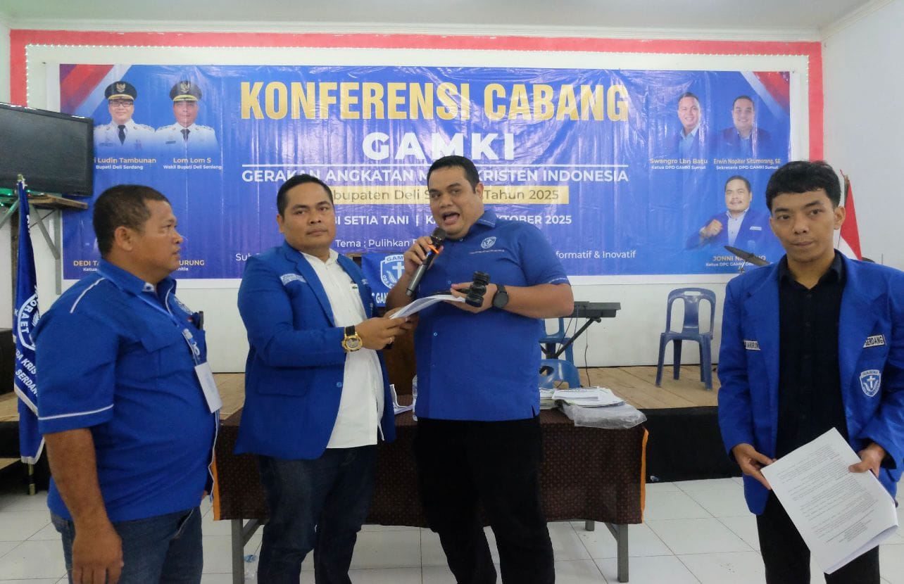 Deli Serdang – Jonni Naibaho kembali terpilih sebagai Ketua Dewan Pimpinan Cabang (DPC) Gerakan Angkatan Muda Kristen Indonesia (GAMKI) Kabupaten Deli Serdang untuk masa bakti 2025–2028. Pemilihan ini berlangsung secara aklamasi dalam Konferensi Cabang (Konfercab) yang digelar di PJ GBI Setia Tani, Kecamatan Patumbak, Kabupaten Deli Serdang, Sumatera Utara.