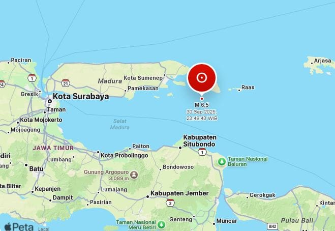 SUMENEP, JAWA TIMUR — Gempa bumi berkekuatan 6,5 Skala Richter (SR) mengguncang wilayah 50 km Tenggara Sumenep, Jawa Timur, pada Selasa malam (30/9/2025) pukul 23:49 WIB. Badan Meteorologi, Klimatologi, dan Geofisika (BMKG) menyatakan gempa ini tidak berpotensi tsunami.