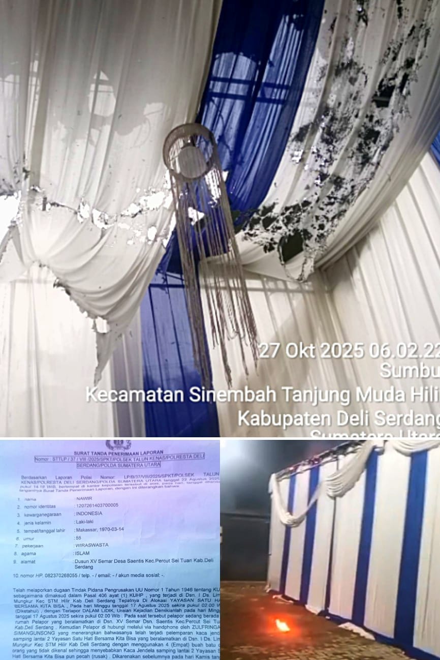 Deli Serdang – Peresmian Gedung Baru Yayasan Satu Hati Bersama Kita Bisa di Kabupaten Deli Serdang, Senin (27/10/2025) sore, diwarnai dengan insiden pelemparan bom molotov oleh orang tak dikenal pada dini hari sebelum acara berlangsung.